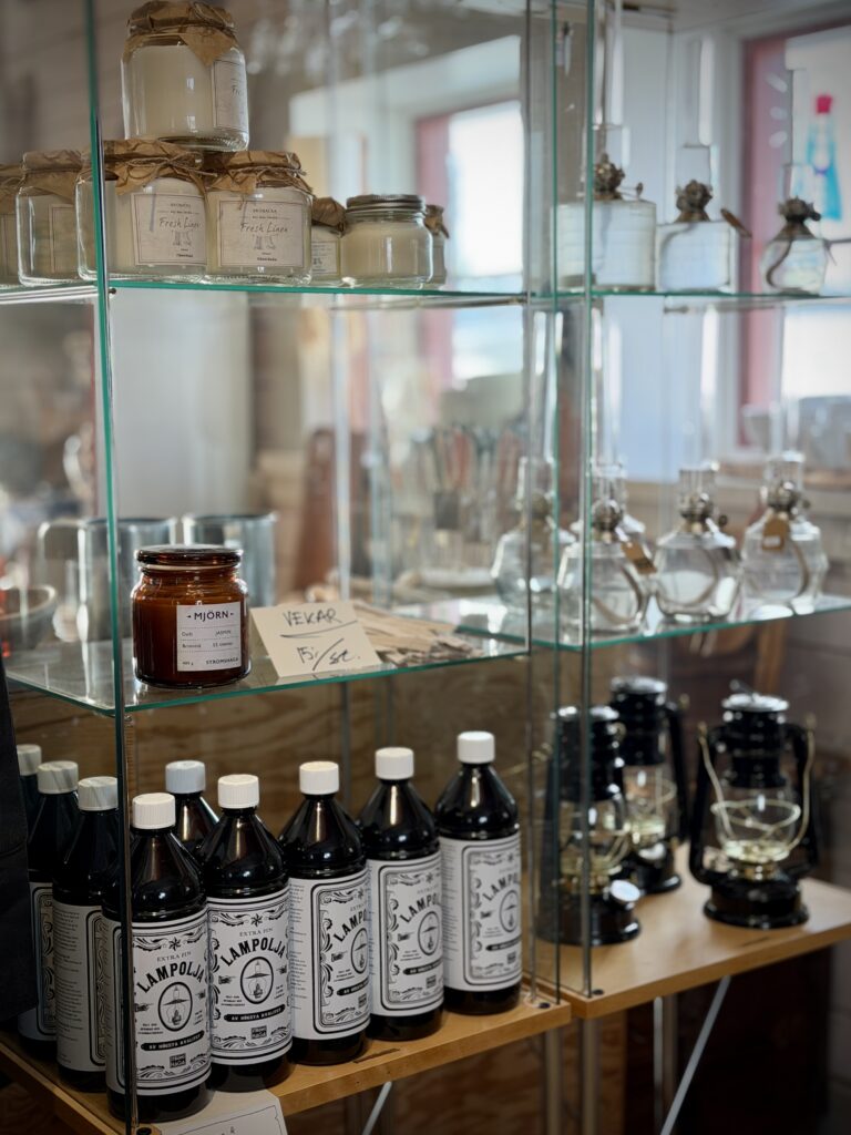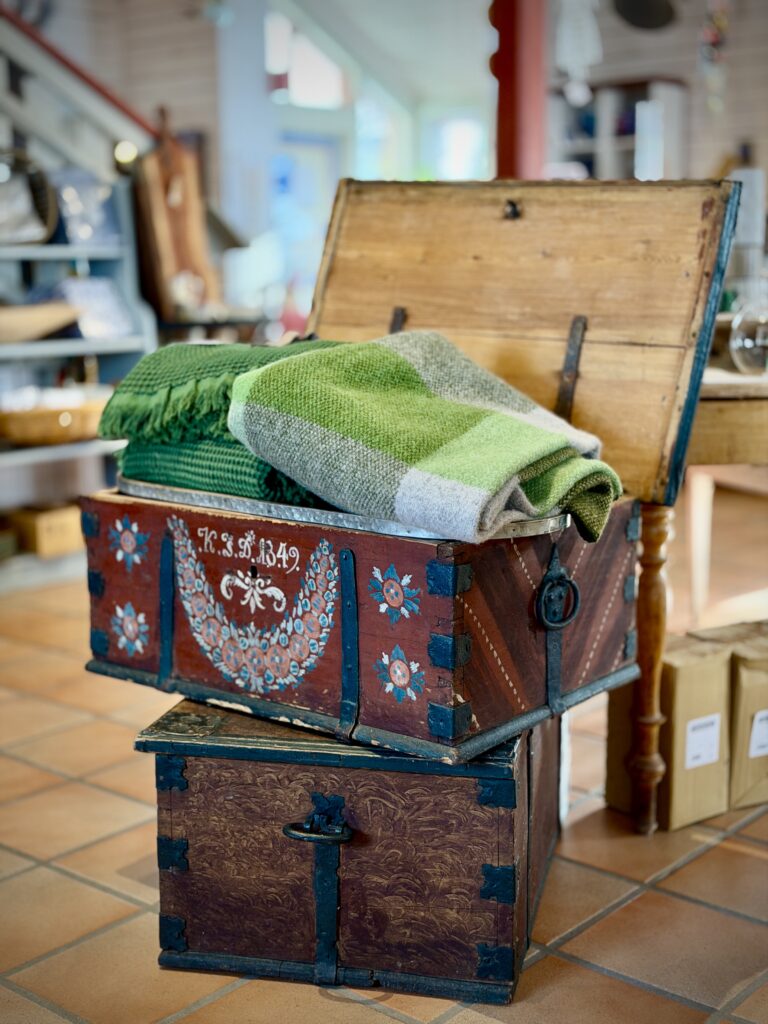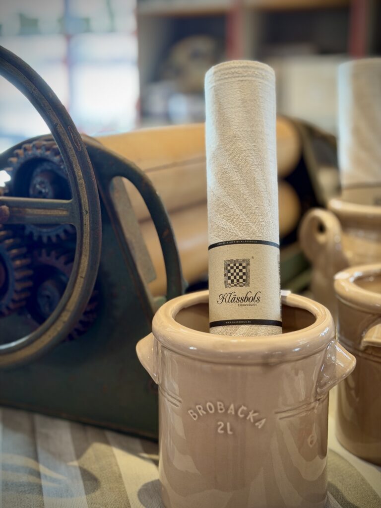 I vår butik finns produkter från Klässbols linneväveri, väskor från MyWalit, värmländsk keramik, glas, inredningsartiklar och naturligtvis våra hemvävda gardiner och mattor av egen design.